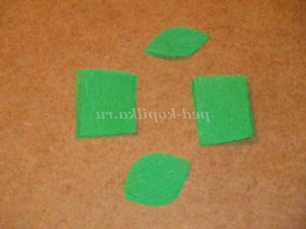 24. Вирізаємо з зеленої гофрованого паперу маленькі листочки. Довгу смужку шириною 3 см складаємо гармошкою. Виходить прямокутник зі сторонами 2 і 3 див. Вирізаємо листочки.