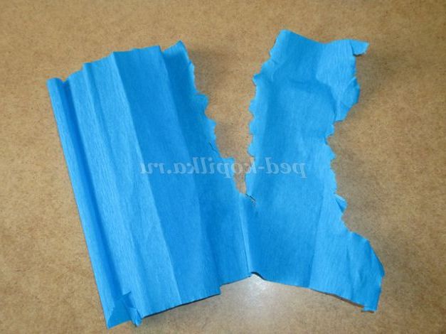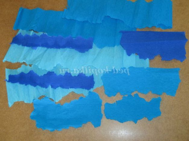 1.Под основу ми беремо стельову плитку. Визначаємо розмір основи: кладемо обрану гілочку на стельову плитку і помічаємо зайве, а потім відрізаємо ножицями. На основі з гофрованого паперу зробимо небо. Для цього візьмемо папір різних відтінків синього кольору і будемо довільно відривати від цілого шматка невеликі смужки з нерівними краями - це хмари.