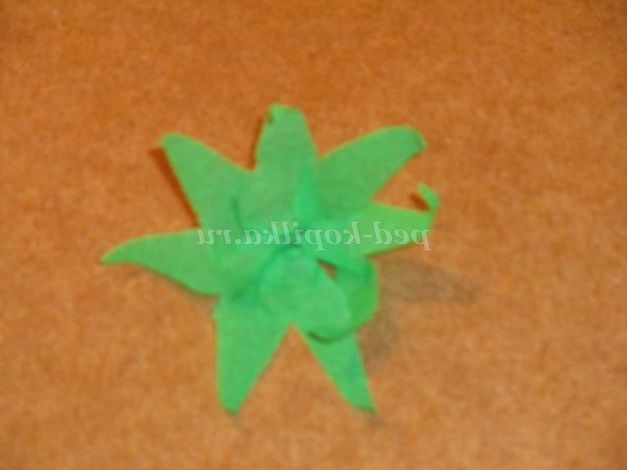 17. Вставляємо тичинки в отвір в середині квітки. Приклеюємо квітка до чашолисткам стельовим клеєм.