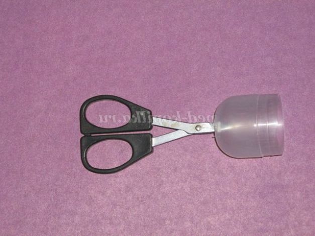 4. Гострими маленькими ножицями робимо отвори в центрі квітки. Щоб квітка не тріснув потрібно не протикати ножицями пластмас, а прокручувати їх туди-сюди з натиском (робиться легко і дитина цілком впорається з цим завданням).