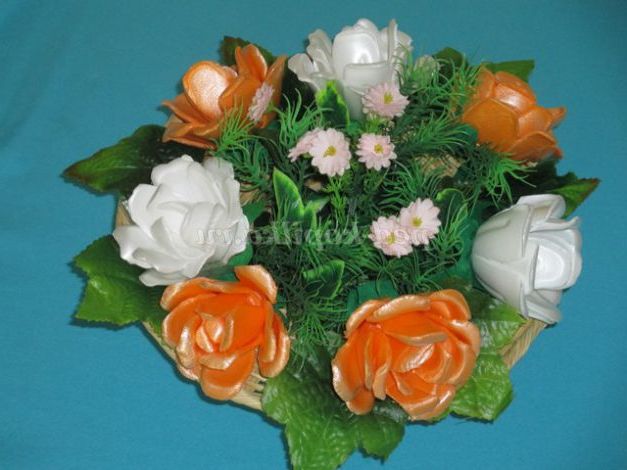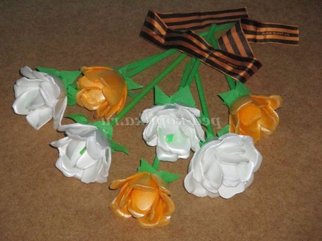 Дорогі колеги! Напередодні свята дня Перемоги я оформила кошики з трояндами для покладання до пам'ятника героям, полеглим у Великій Вітчизняній війні. Кошик з квітами можна використовувати і в якості подарунка ветерану ВВВ. Якщо ми поміняємо георгіївську стрічку на святковий бантик, то така кошик буде служити хорошим подарунком на будь-яке торжество. Підбираючи кошики різної форми, ми отримаємо різноманітність вибору подарунка.