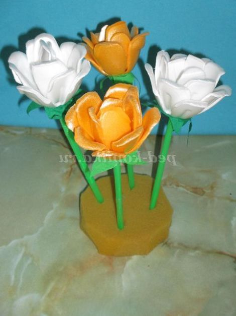 5.Берем товстий поролон і робимо в ньому 4 надрізу ножицями, вставляємо в прорізі стебла з трояндами, вони добре тримаються. Можна приклеїти.
