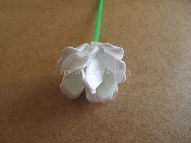 8. Нанизуємо на коктейльну паличку три чашечки з пелюстками, приклеюємо їх між собою. Вирізаємо кілька загнутих дугою пелюсточку і приклеюємо в середину зібраного квітки. Це інший варіант квітки.