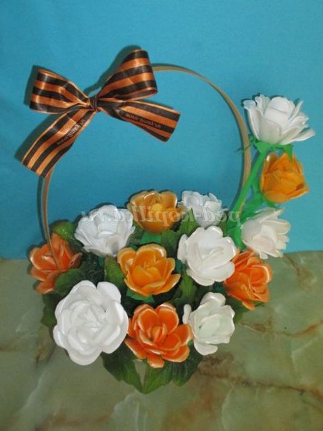 10. Зав'язуємо на ручці бантик з георгіївської стрічки. Кошик з квітами готова! Таку корзину можна подарувати ветерану ВВВ, а можна покласти до обеліска героїв, полеглих у ВВВ у день Перемоги 9 травня.