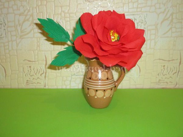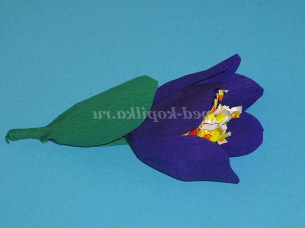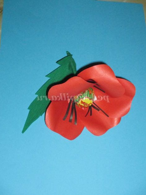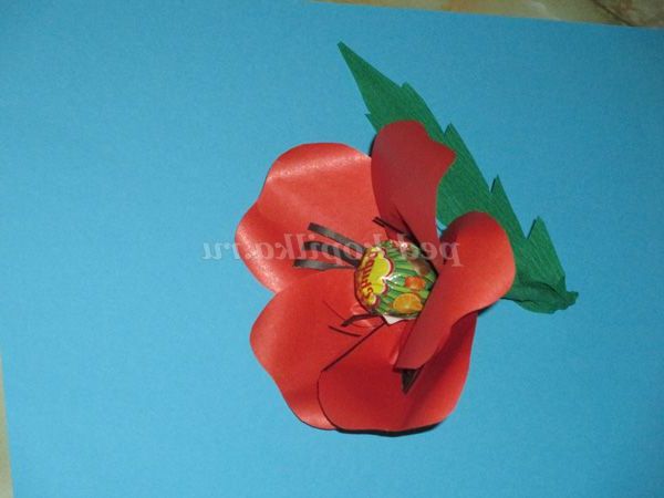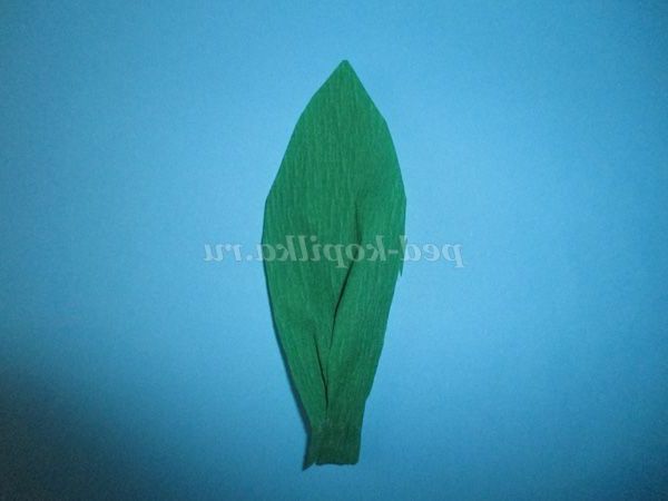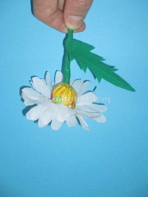 9. Вирізаємо прямокутник зеленого кольору заввишки з «Чупа-чупс», складаємо навпіл по довшій стороні і зрізаємо кути до лінії згину. Приклеюємо на стебло.