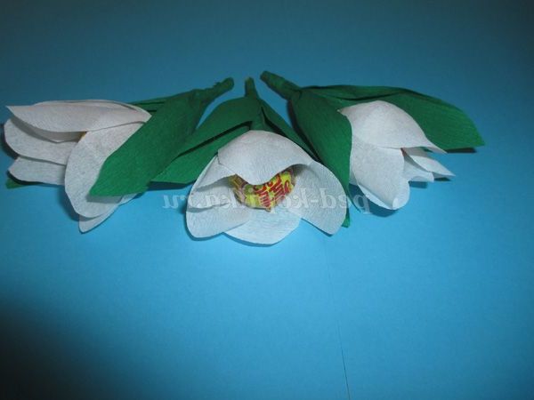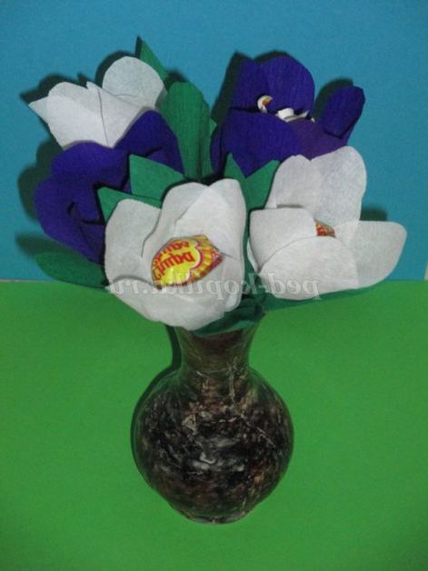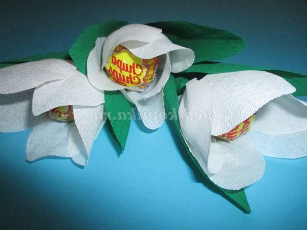 У перший весняний святковий день 8 березня усі жінки чекають привітань, подарунків, квітів. А, щоб чоловіки не забували зробити це, думали про це заздалегідь, намагалися піднести подарунок незвично, ми повинні з малих років навчити хлопчиків проявляти увагу, турботу, повагу, любов до милим жінкам. Тому давайте навчимо хлопчиків бути уважними до дівчаткам вже в дитячому саду в своїй групі, в школі у своєму класі і далі... Хочеться показати як ми з хлопчиками оформили квіти на цукерках «Чупа-чупс». Цю ідею можна внести і як сюрпризный момент на ранок, присвячений 8 березня. Тут можна використовувати будь-якого героя, який йде збирати підсніжники - це Весна, Попелюшка, герої-звірі, Омелько. І ось які солодкі квіти можна приготувати дівчаткам.