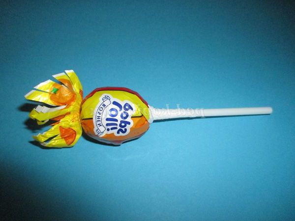 16. Наклеюємо її на «Чупа-чупс» так, щоб була видна вся жовта серединка квітки.
