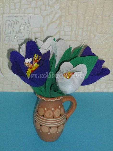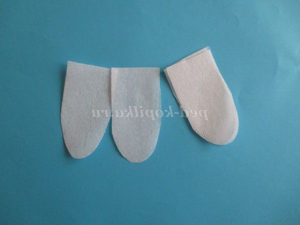 1. Проліски. Робимо пелюстки. Вирізаємо прямокутники з крепованого паперу білого та фіолетового кольору. Розмір визначаємо за величиною «Чупа-чупс» як показано на фото.