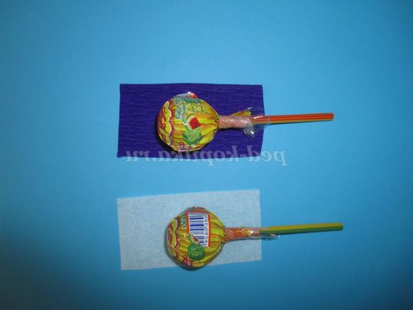 Матеріал: льодяник на паличці «Чупа-чупс», крепований папір білого, фіолетового, червоного і зеленого кольорів, ножиці, олівець, клей-олівець.