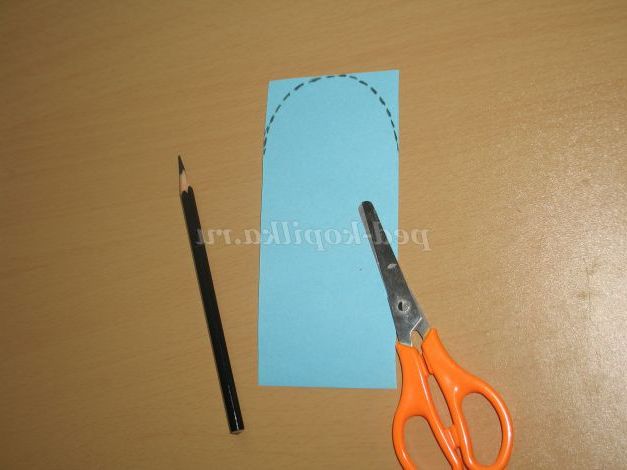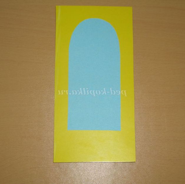 7. Беремо блакитний прямокутник, намічаємо олівцем лінію скруглення і обрізаємо ножицями по лінії. Отримуємо вікно.