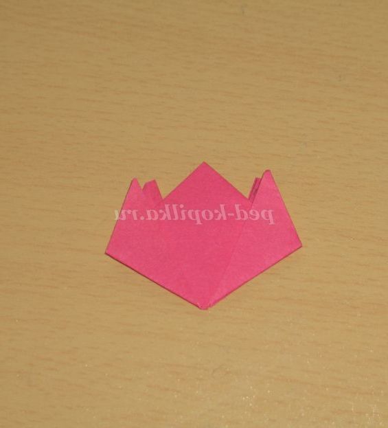 6. Перевертаємо заготівлю і також піднімаємо куточки з іншого боку. Отримуємо бутон. (робимо ще два бутона з двох квадратів)