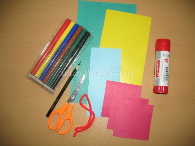 Для виготовлення поробки знадобиться: прямокутник з жовтого картону розміром 22х10 см, прямокутник з блакитного паперу розміром 4,5х14,5 см, три квадрата з малиновою (червоної) двосторонній паперу розміром 7,5х7,5 см, зелена папір, олівець, ножиці, клей-олівець, кольорова нитка або стрічка, фломастери.