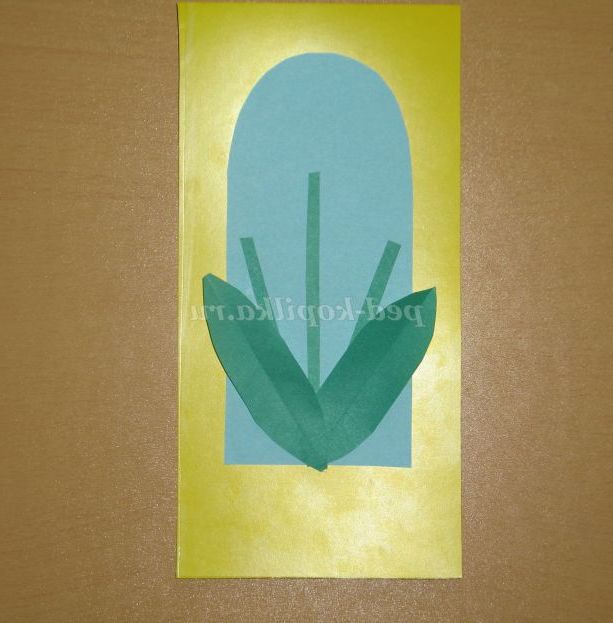 10. На заготівлю листівки приклеюємо стебла і листя (бажано листя приклеювати за нижній край, щоб вони виглядали об'ємними)