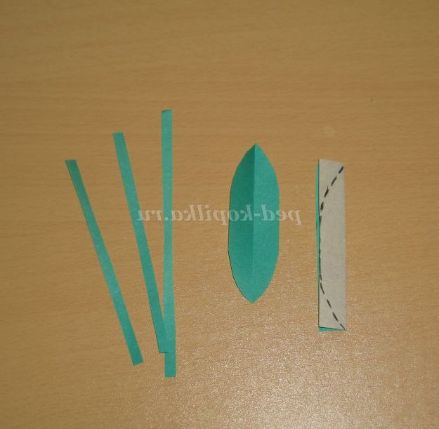 9. З зеленого паперу вирізаємо три смужки шириною 0,5 см (стебла), два прямокутника 2,5 х 8 див. Прямокутники складаємо навпіл, намічаємо лінію відрізу і вирізаємо листя.