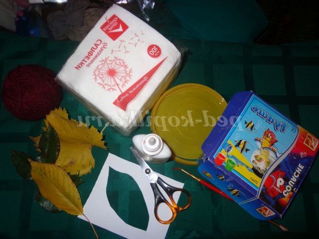 Для роботи необхідно: Папір - самоклейка, серветки, клей ПВА, пензлик, фарби (гуаш), нитки, шаблони листів або листя з різних дерев (дуба, клена, берези тощо).