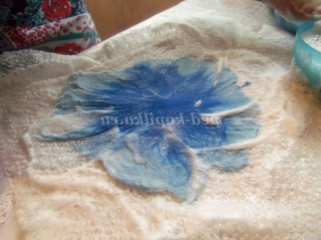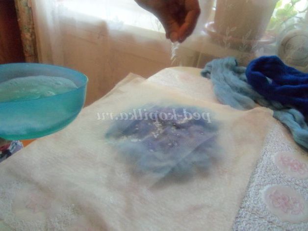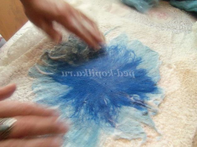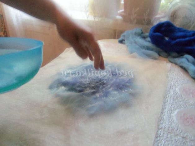 9. Наступний етап - акуратно починаємо клеїти. Делікатно розтираємо шерсть долонями прямо по сітці. Злегка натискаючи на москітну сітку, погладжуємо, розподіляючи мильну воду по всьому діаметру майбутньої брошки