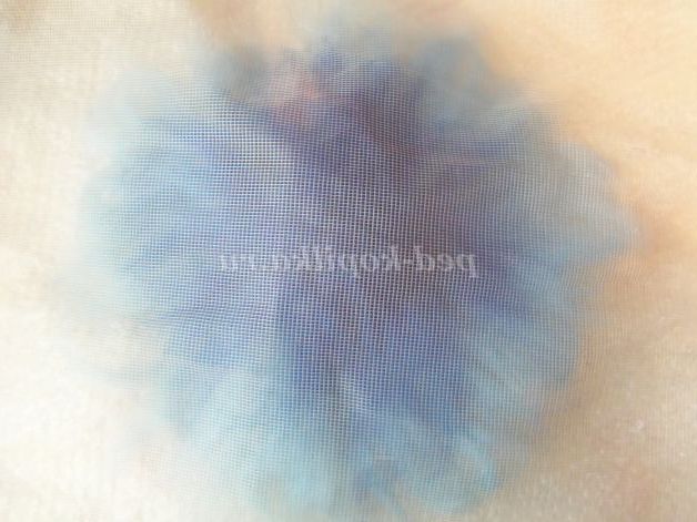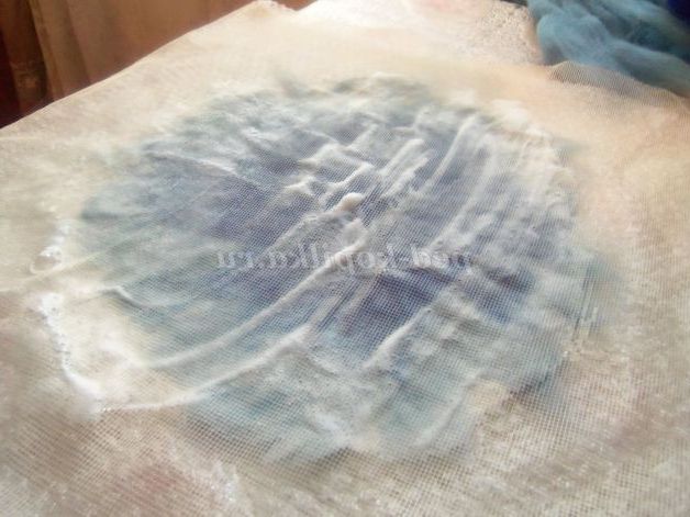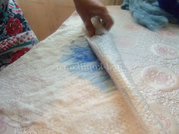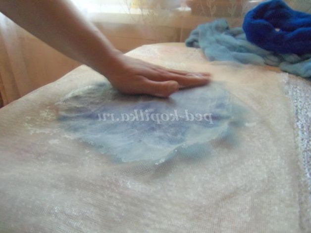 6. На клейонку підкладаємо пухирчастий пакет (його можна покласти на клейонку відразу, до викладання вовни), накриваємо пухнастий млинець з вовни москітною сіткою