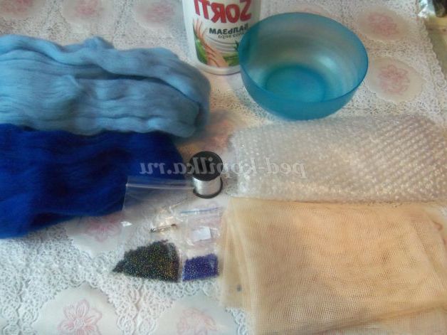 13. Переходимо до наступного етапу - валяння без сітки. Прибираємо вже непотрібну нам москітну сітку, і починаємо клеїти брошка у пухирчатою плівки.