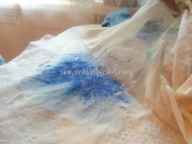 7. У мисці розводимо миючий засіб гарячою водою і починаємо акуратно поливати викладену під сіткою шерсть. Можна використовувати пульверизатор, але я бризкала прямо з руки