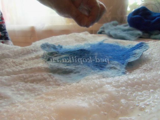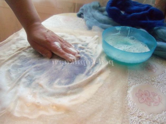 11. Коли шерсть трохи притреться, посилюємо тиск. Починаємо клеїти сильніше, натискаючи на вовну в різних напрямках, так валяем хвилин 20-30
