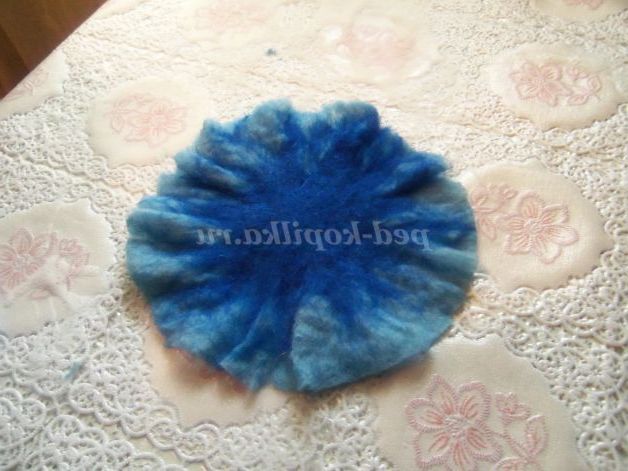 1. Розстилаємо на столі клейонку і починаємо укладати пучки блакитної вовни по колу, висмикуючи їх з мотка вовни. Саме висмикуємо, а не відрізаємо, так шерсть буде краще звалюватися.