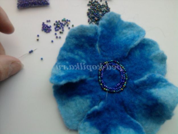 28. Після сушіння починаємо прикрашати брошку. Для моєї брошки мені знадобився бісер двох кольорів, для серцевини я використовувала бісер блакитного кольору, для пелюсток - темно-синій. Обидва кольору з бензиновим відливом