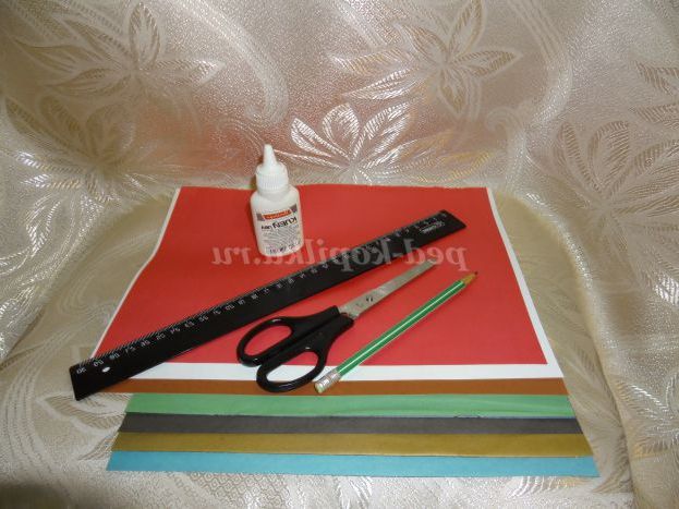 Необхідні матеріали: ножиці, клей, кольоровий папір, білий картон для основи листівки, лінійка, простий олівець (Фото 1)