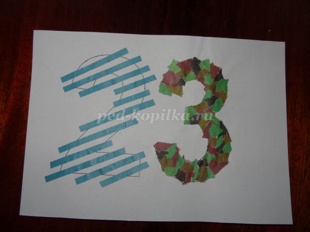 На цифру 3 приклеїмо приготовані різнобарвні дрібні шматочки кольорового паперу в довільному порядку - вийшла цифра в камуфляжі (Фото 6)