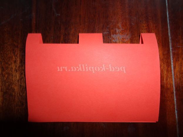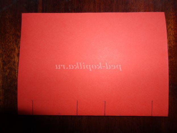 ½ листа червоного паперу складемо навпіл і зробимо розмітку олівцем, відступивши від країв ~ 1,5 см, потім ще 4,5 див. разрежем по намічених лініях і зробимо сходинку (Фото 10,11,12)