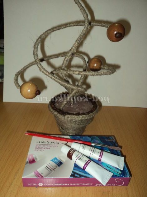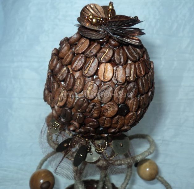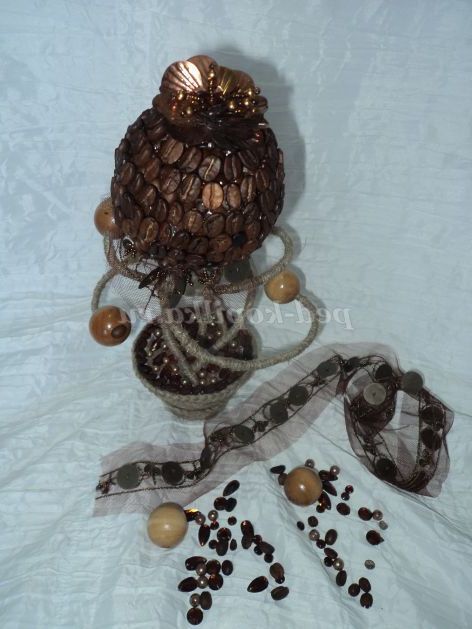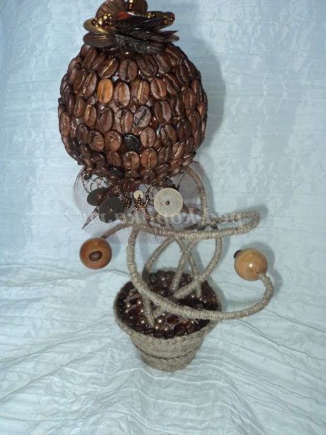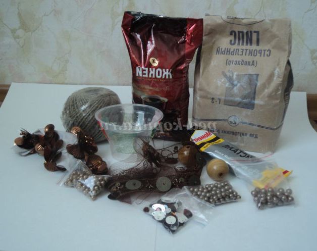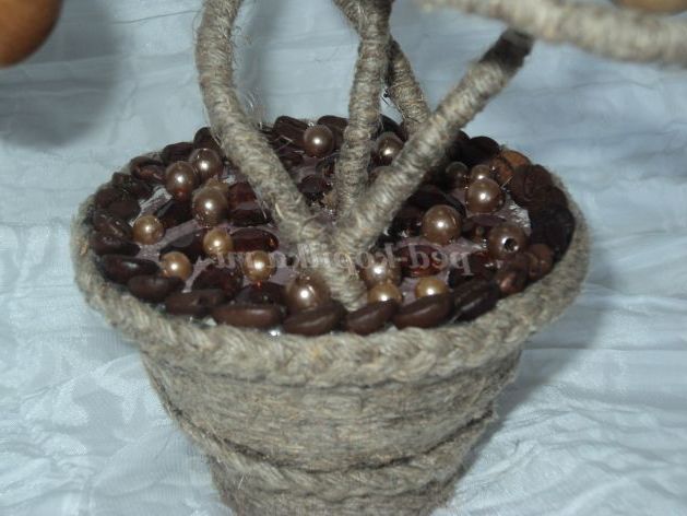 Матеріали: ємність з-під йогурту, 2 метра дроту,гіпс будівельний, шпагат, кава в зернах, клей "Момент Кристал", тасьма, намистини і акрилові камені, квіточка, фарби акрилові, дерев'яні намистини 3 шт, тенісний м'ячик.