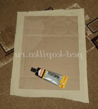 Натягуємо тканину на картонний аркуш так, щоб аркуш А3 опинився під тканиною. Краї тканини приклеюємо із зворотного боку і зверху приклеюємо другий аркуш А3. Так ми закриваємо задню частину картини.