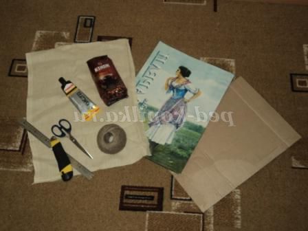 Матеріали:2 аркуша формату А3, пакувальний картон, тканина лляна, кава в зернах, лляний шпагат, клей "Момент Кристал", ножиці.
