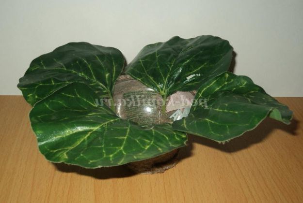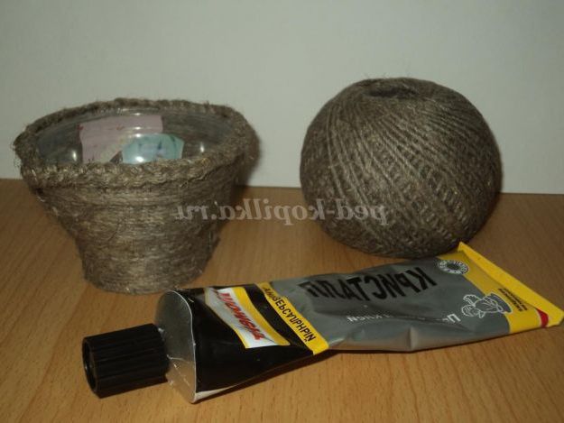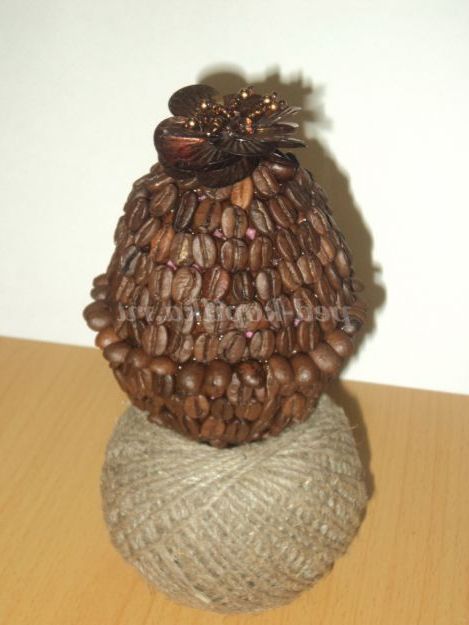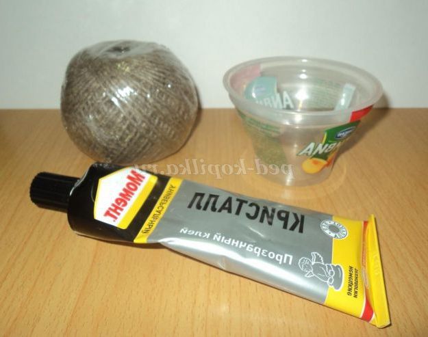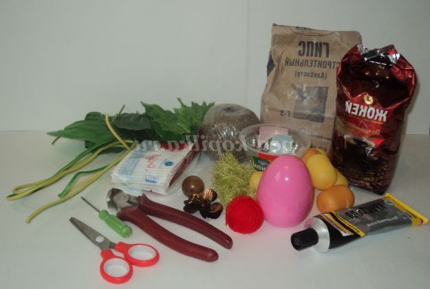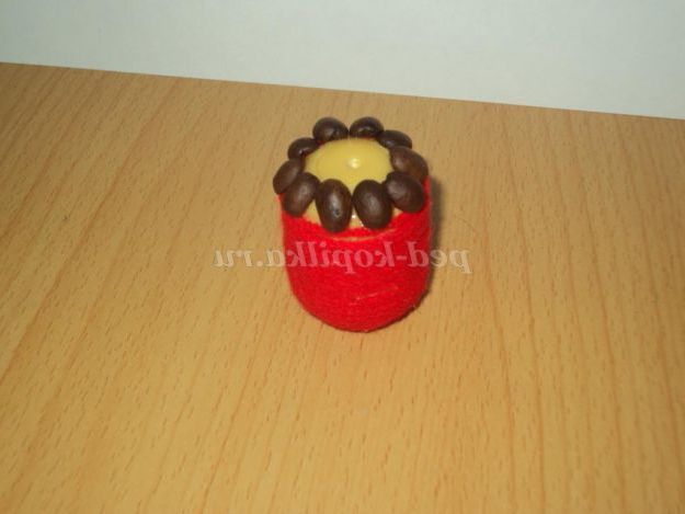 Матеріали: ємність з-під йогурту, гіпс, кава в зернах, дріт, яйця «Кіндер-сюрприз» маленькі і одне велике, готовий квіточку, дерев'яна намистина велика, залишки пряжі, ватяні палички, шпагат, штучні листя, клей «Момент кристал».