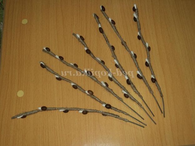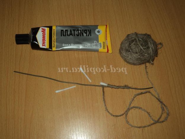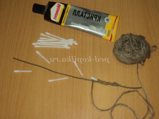 На дріт намотуємо шпагат, по ходу приклеюючи по половинці ватної палички, фіксуючи всі клеєм.