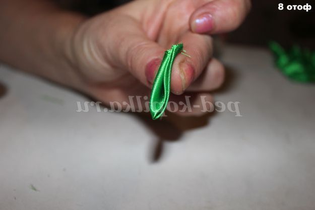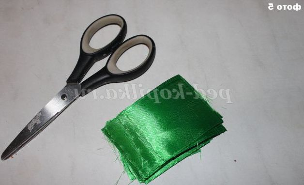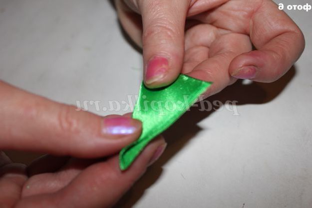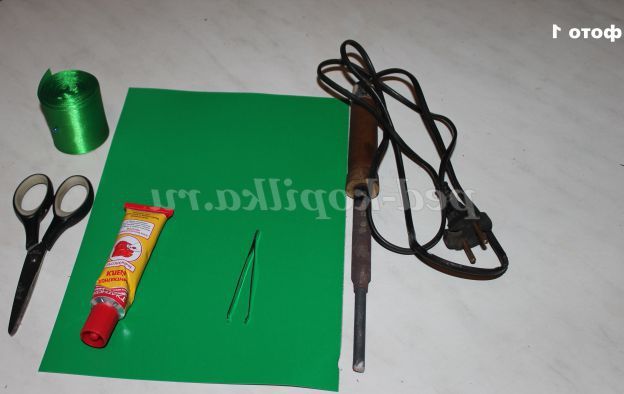 Вам знадобиться: 10 метрів зеленої атласної стрічки шириною 5 см,зелений картон, ножиці, пінцет, клей універсальний, паяльник електричний