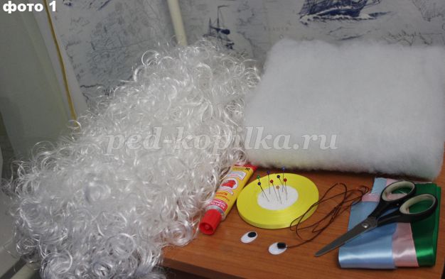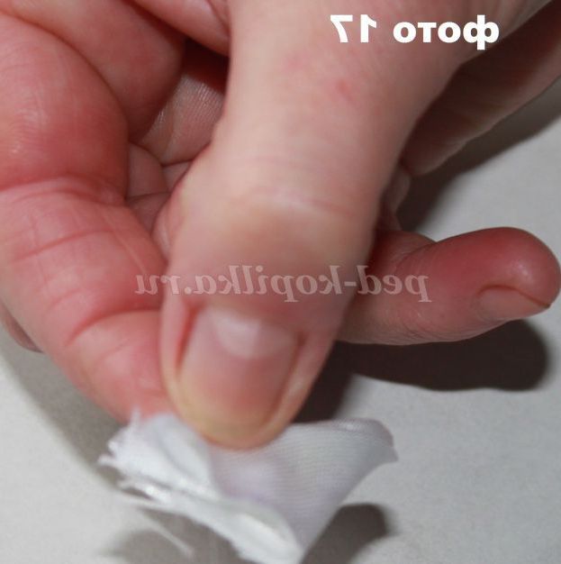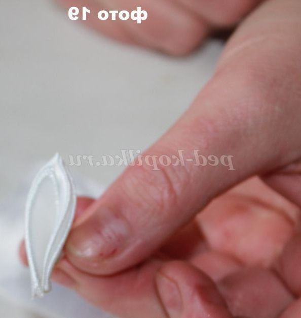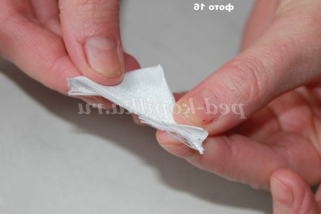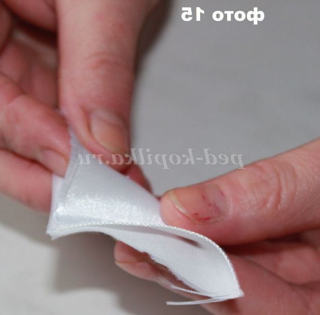 Потім пришиваємо вушка, їх я зробила з білої стрічки шириною 5 см-складаючи як гострий пелюстка.