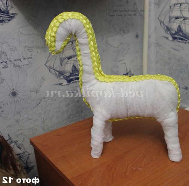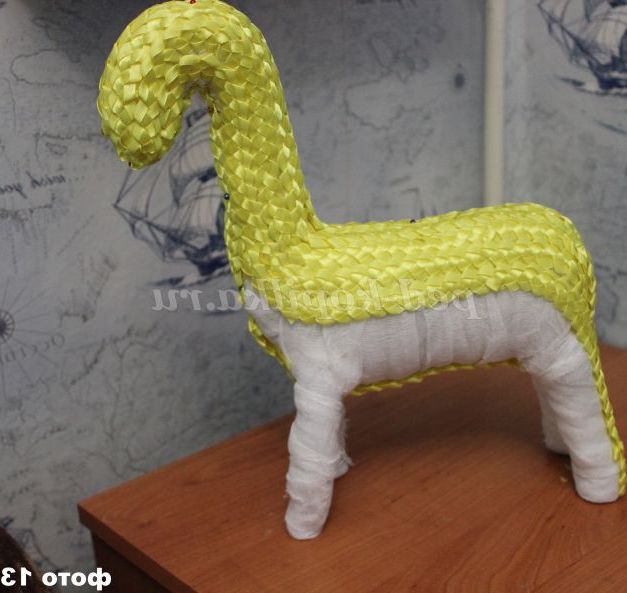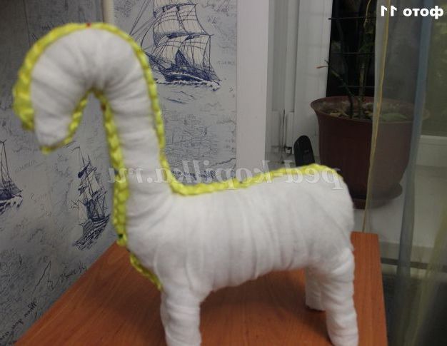 Беремо синтепон, нарізаємо його на стрічки шириною 2-3 см і починаємо обкручувати наш поки ще скелет. Поступово нарощуючи нашої конячці м'язи, стегна, шию ну і все інше.
