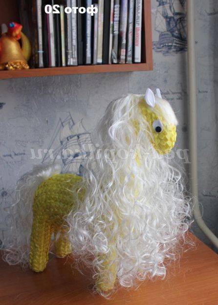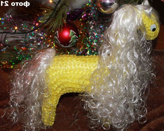 Приклеюємо очі. З білих штучних волосся клеїмо гриву і хвіст. Розправляємо ніжки, щоб були рівними. І милуємося красою нашої.