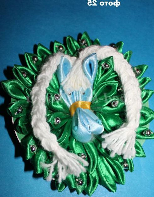 Для роботи нам знадобиться зелена атласна шириною 5см-близько двох метрів, 30 см блакитний атласної стрічки шириною 5см,зелений картон, , , паяльник електричний, клей універсальний, трохи жовтої стрічки шириною 5 мм, оченята, намистинки-ніздрі.