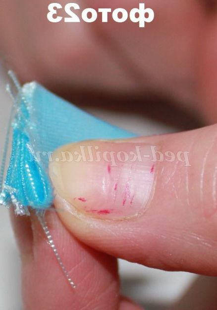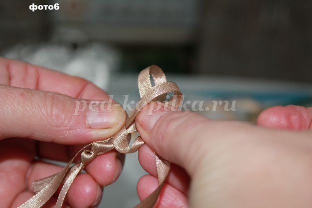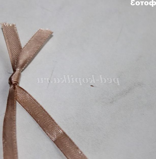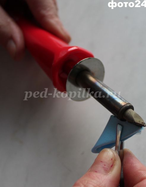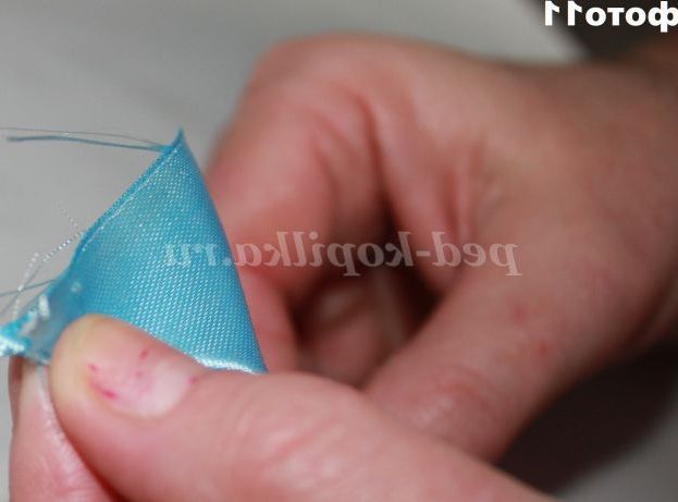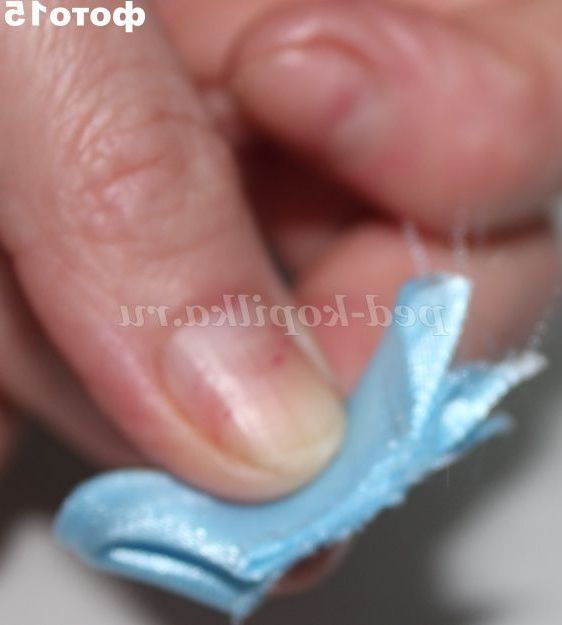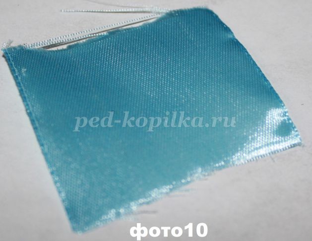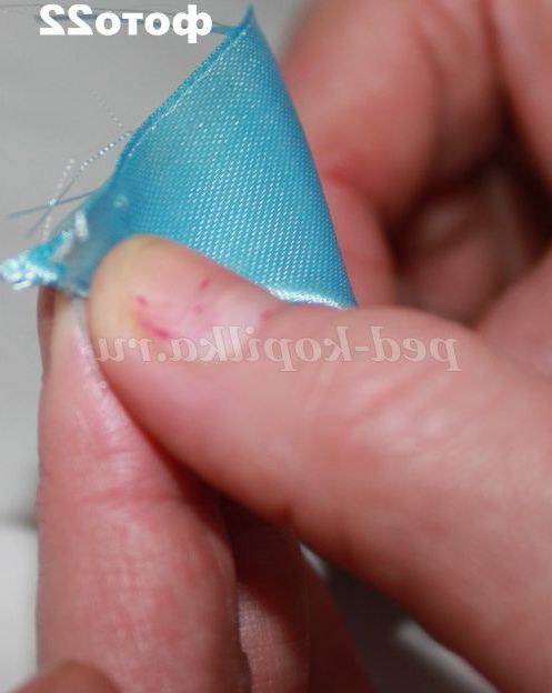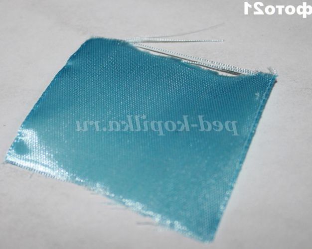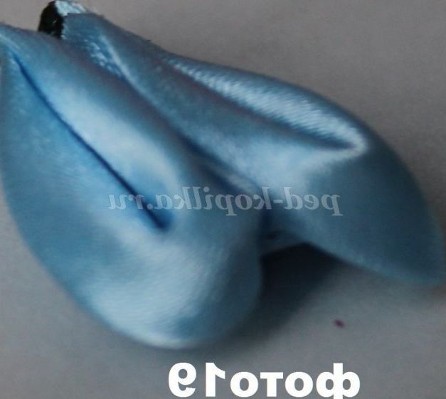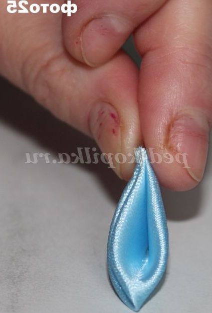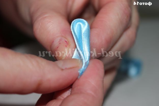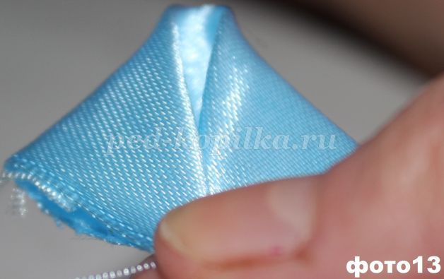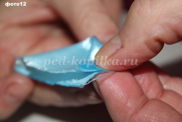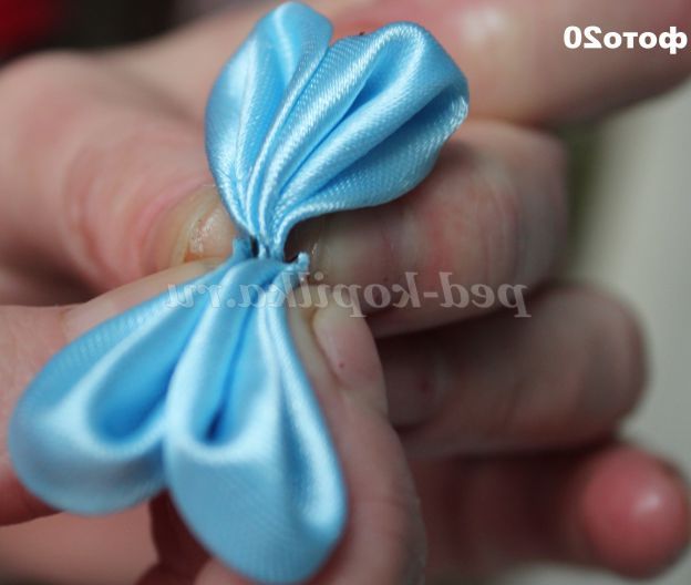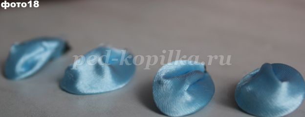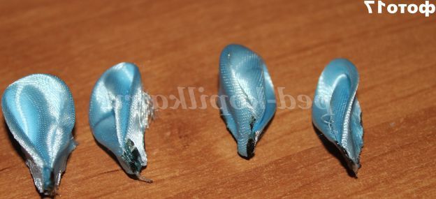 Блакитну стрічку розрізаємо на 6 квадратів розміром 5 см на 5 див. Складаємо 4 круглих пелюстки