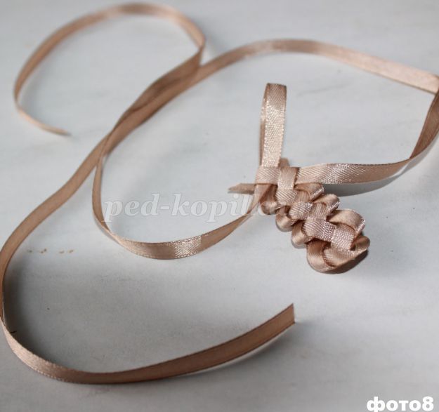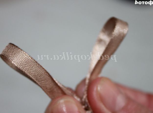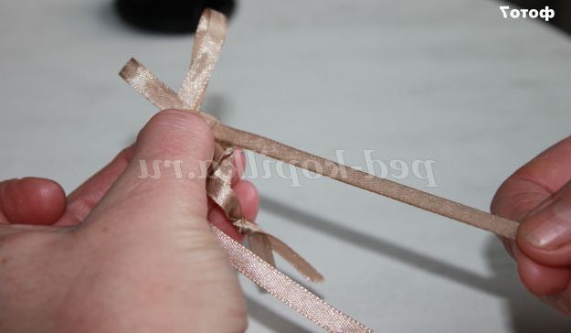 Тепер плетемо з сірої стрічки фенечки. Беремо дві стрічки кожна розміром 1 метр і пов'язуємо їх вузликом.