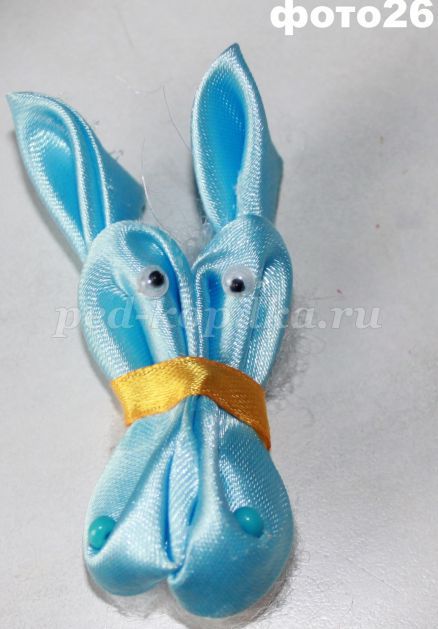 Приклеюємо вушка до верхньої частини голови, шов закриваємо жовтою стрічкою, клеїмо оченята, намистинки-ніздрі