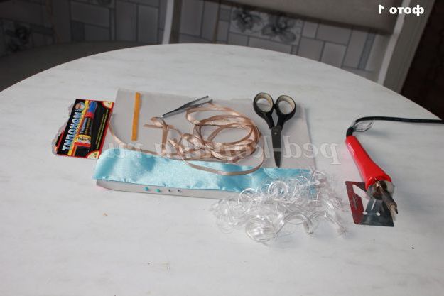 Для роботи нам знадобиться: картон, , кілька метрів сірої стрічки шириною 5 мм, трохи атласної стрічки (10 см) білого кольору, 50 см блакитний атласної стрічки шириною 5 см, трохи жовтої стрічки шириною 5 мм, універсальний, оченята, намистинки-ніздрі, 30 см блакитний атласної стрічки шириною 5 см, трохи штучних волосся, паяльник електричний, пінцет.