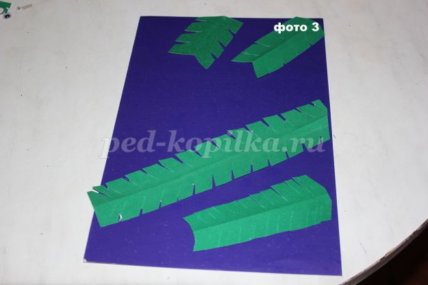 По лінії згину зробіть надрізи по всій довжині смужок. Розгорніть смужки. Підготовлені деталі - гілки ялинки закріпіть клеєм гілки ялини на картоні.