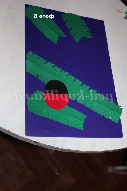 З червоного паперу виріжте два кола - один діаметром 3 см, інший діаметром 4 див. З чорної оксамитової папери також вирізаємо один коло діаметром 3 см, інший 4 см, з чорною оксамитовою паперу виріжте пір'ячко для хвостика і крильце на грудку