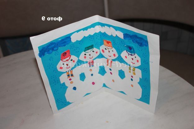 Закриємо листівку, зігнувши не приклеєних сніговиків вперед. Розгортаємо листівку, сніговики висуваються вперед.