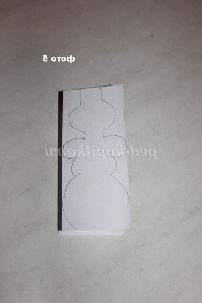 Намажемо клеєм першого і останнього сніговика. Приклеїмо першого і останнього сніговика, так що б лінії згинів листівки і центральних сніговиків збіглися.