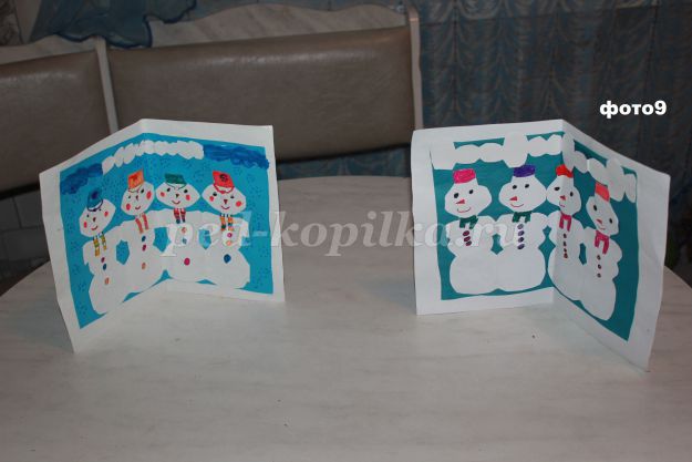 Закриємо листівку, зігнувши не приклеєних сніговиків вперед. Розгортаємо листівку, сніговики висуваються вперед.