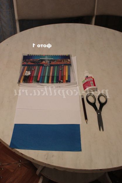 Візьміть білу папір розміром 16х24 див. Приклеїмо на неї синій папір по центральному згину