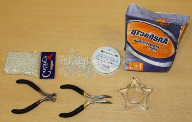 Для виготовлення ялинки нам буде потрібно: дріт для бісероплетіння (мідь) діаметром 0,3 мм, перламутрові пластикові намистини 3 мм, кусачки, флористична стрічка білого кольору, алебастр (будівельний гіпс), скляна підставка.